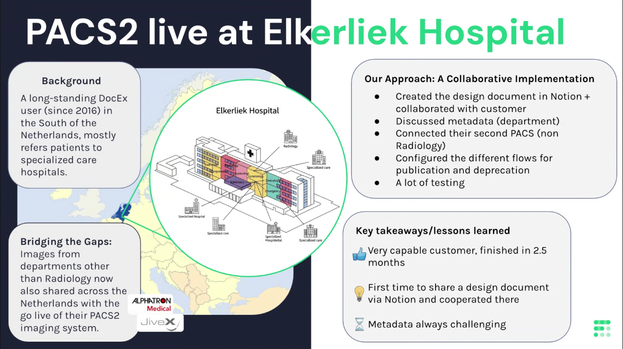 Eerder deze maand heeft het Elkerliek Ziekenhuis (Helmond) hun PACS2 (Alphatron/Visus JiveX) aangesloten op hun XDSCloud omgeving. Met deze koppeling is het 10de JiveX PACS aangesloten in Nederland en stelt Elkerliek ook beeldvormende onderzoeken van andere specialismen dan radiologie beschikbaar aan ander ziekenhuizen in de regio en daarbuiten.